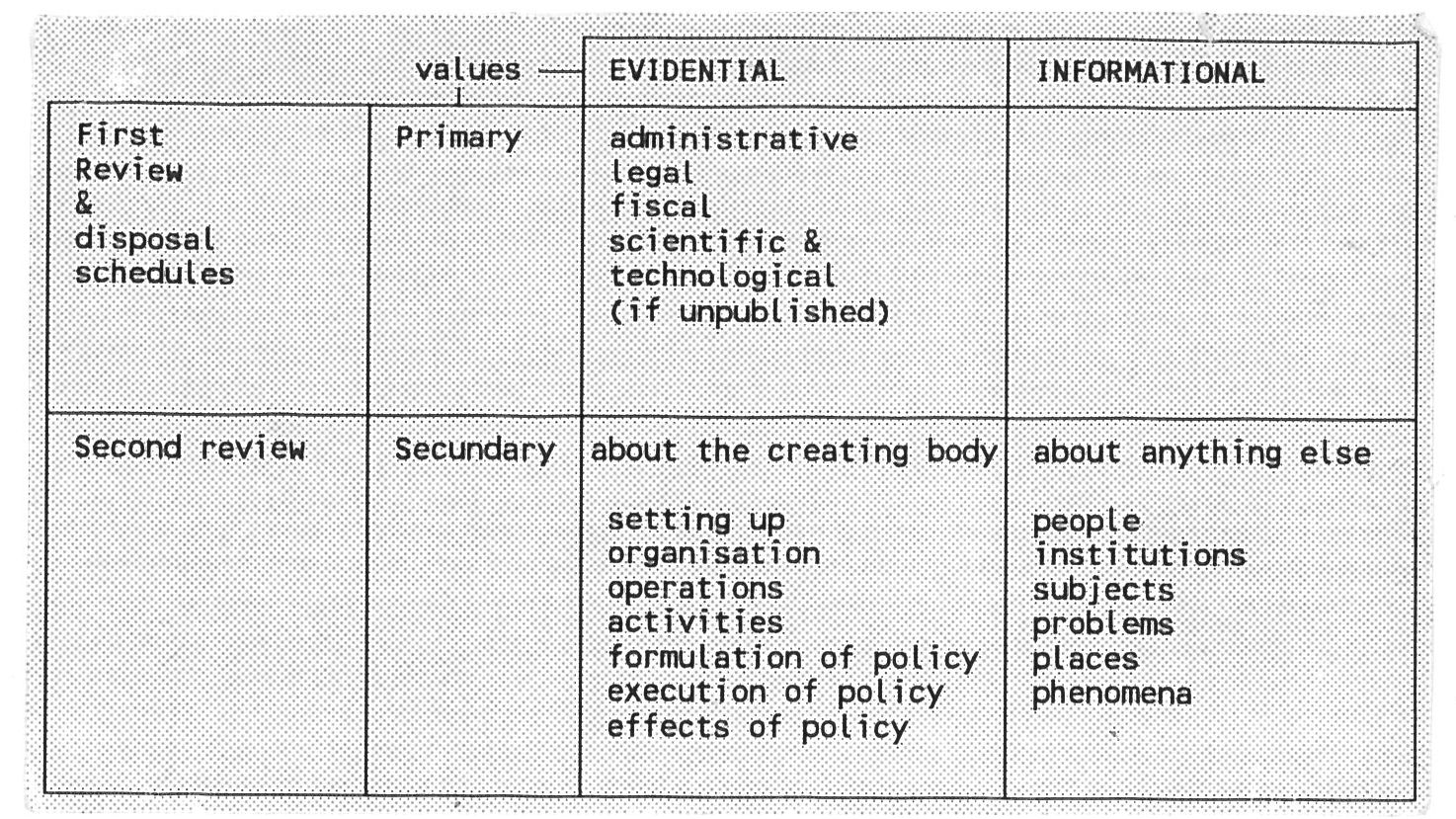 De scan van dit schema staat op de laatste pagina van een korte notitie van het Public Record Office (PRO) uit Groot-Brittannie getiteld 'Appraisal'1. Onderstaande tabellen zijn een vertaling en bewerking daarvan. Als matrix zijn bruikbaar als hulpmiddel bij het waarderen van informatie. De methode gaat uit van de primair een secundaire functies daarvan.