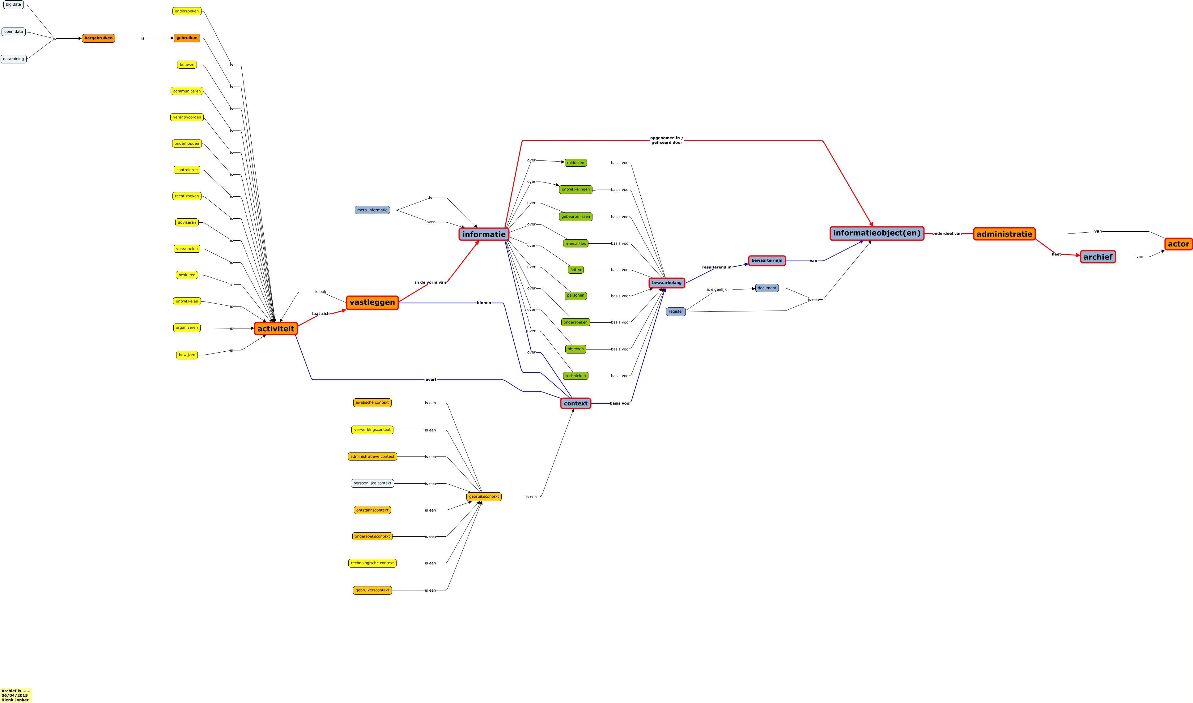 - Activiteiten uitgevoerd binnen een bepaalde context laten zich vastleggen in de vorm van informatie over subjecten of objecten met een bewaarbelang opgenomen en gefixeerd in informatieobjecten die onderdeel zijn van de administratie (archief) van een actor.