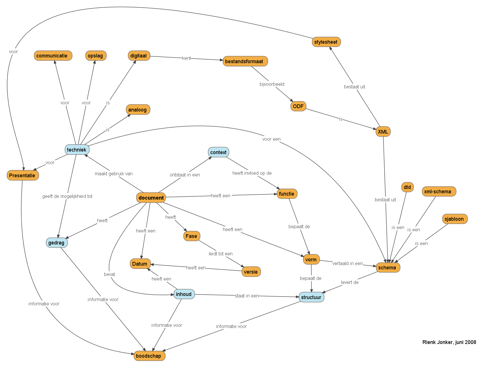 Een poging om een ontologie van een document samen te stellen. Een document bestaat als informatieobject uit tenminste een vijftal kenmerken of elementen. Te denken valt aan inhoud, structuur, gedrag, context en techniek. Per onderdeel zijn vervolgens weer extra elementen met hun onderlinge relatie te benoemen.