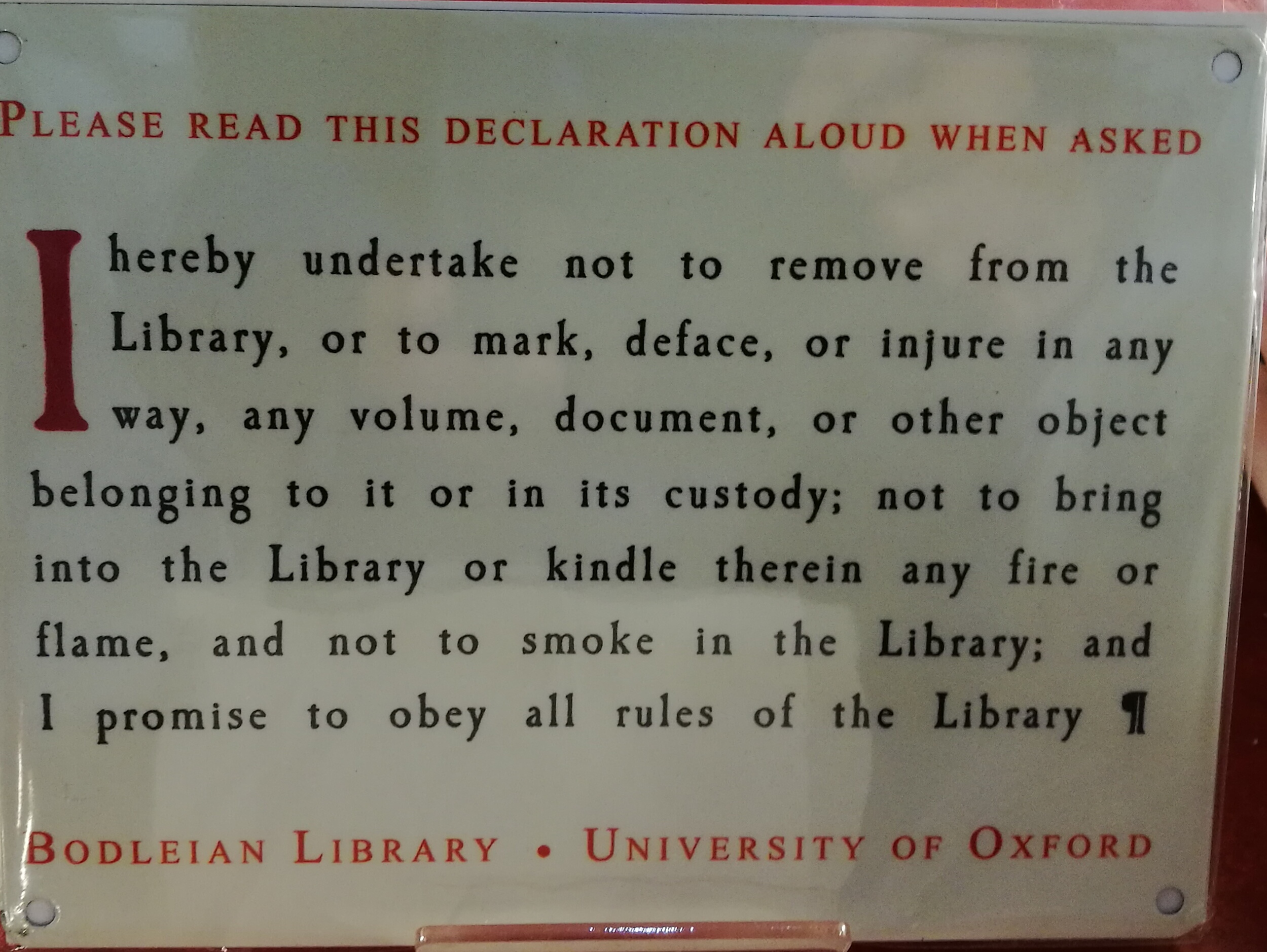 Soort: FotoOnderdeel van een bezoekersreglement Album: BeheerDocumenttypenVan dingen die voorbijkomenLevenscyclus: 3.2 Vaststellen verantwoordelijkheden3.6 Beschikbaarstellen3.7 BeveiligenInformatiemodel: InformatieobjectLocatie: OxfordMaatschappelijk object: Bodleian LibraryLabels: bezoekersreglementverklaringbibliotheekdocumenttypeDatum eerste publicatie: vrijdag, 8 september 2017 - 11:52am 35 keer gelezen