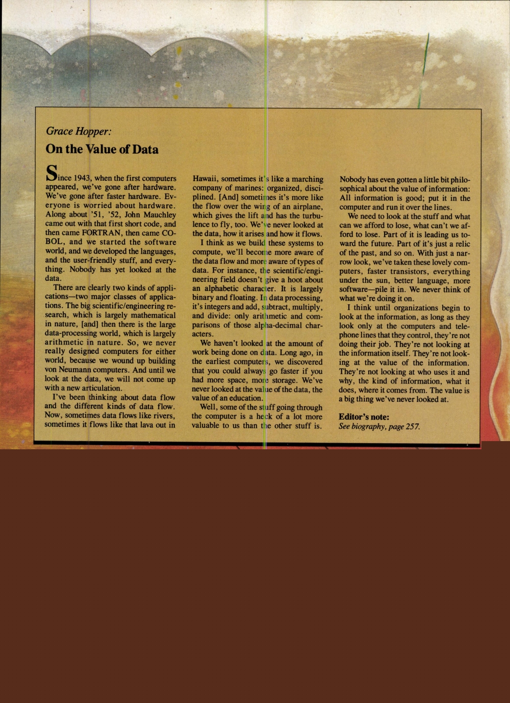 | Samenvatting | Een treffende korte analyse van Grace Hopper over het achterblijven van de juiste inschatting van de waarde van informatie. A remarkable observation made by Grace Hopper in 1990 about the distracting focus on hardware and software instead of a necessary focus on the value of data.