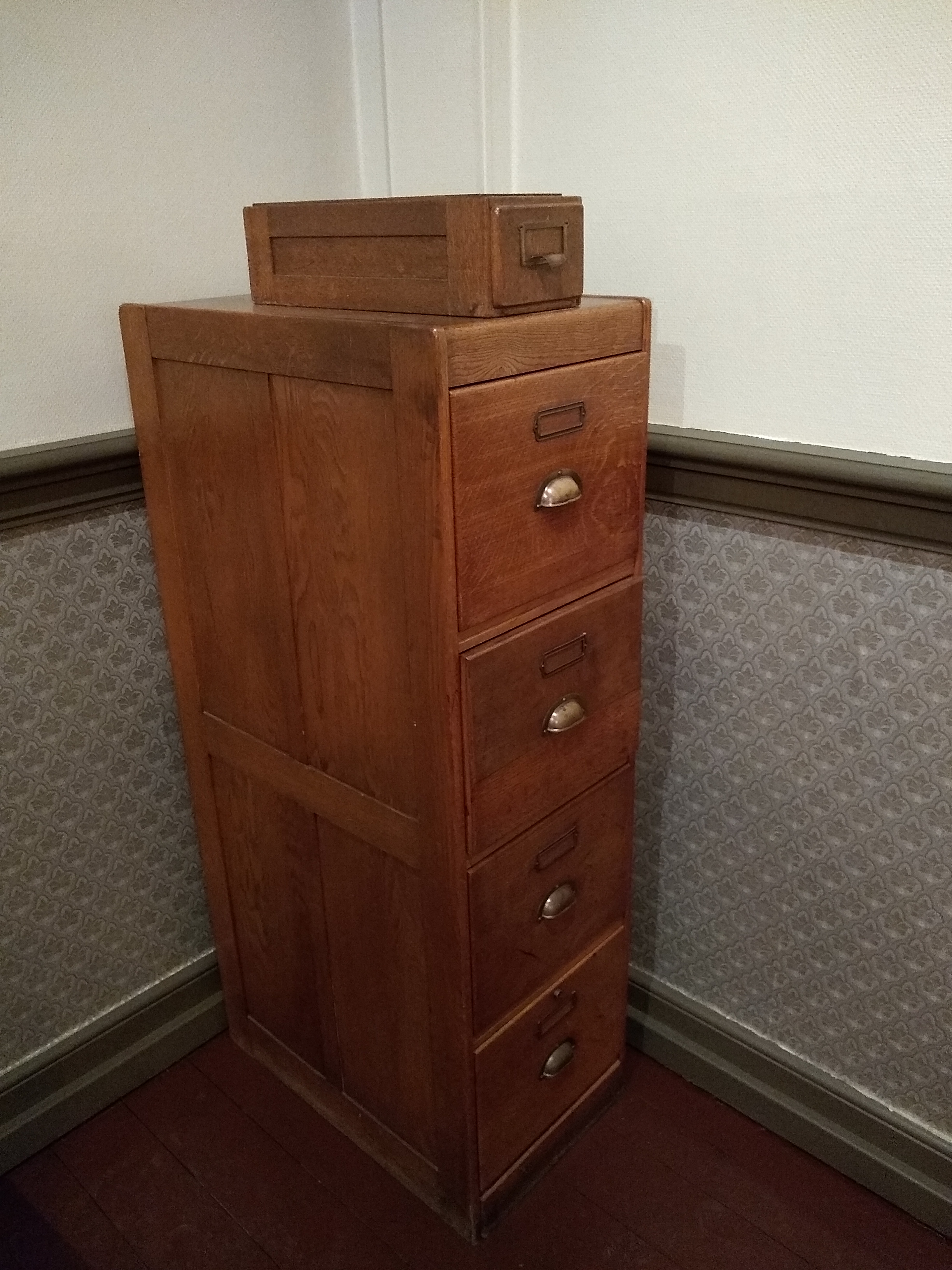 Planokast in het Hans Fallada Haus. Deze kast bevat manuscripten van de Duitse schrijver Hans Fallada,