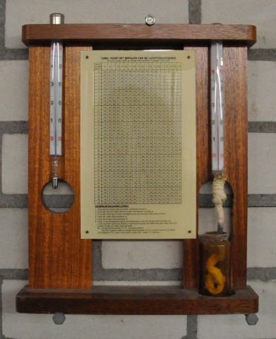 Luchtvochtgheidsmeter met twee thermometers, een droge en een natte. Op basis van de relatie tussen de waarden van beide kon de relatieve luchtvochtigheid (RV) worden bepaald.