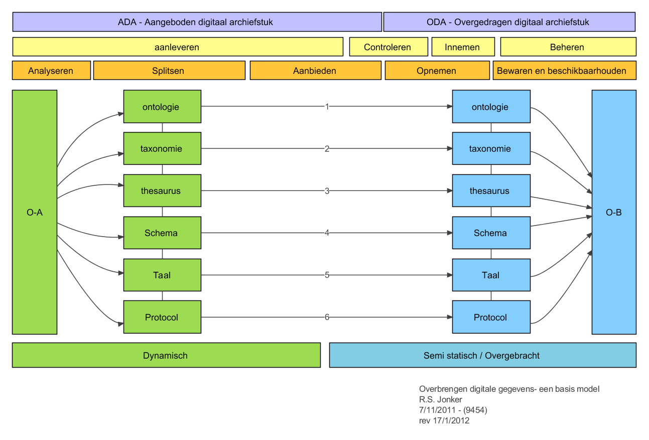 Een eerste model voor overbrenging van digitale gegevens. Dit model is nog geënt op de layercake van het semantisch web in samenhang met de modellen van OAIS en ED3. Dit schema is de voorganger van schema Uitwisselbaarheid dat uitgaat van negen lagen.