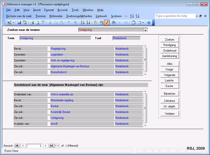 Soort: ScreenshotRaadpleegscherm van de thesaurus. Vanuit dit scherm zijn de nodige acties te starten. Album: Reference managerSchermafdrukkenInformatiemodel: ContextInformatieobjectGedragLabels: literatuurthesaurusDatum eerste publicatie: zondag, 11 juli 2010 - 1:30pm 32 keer gelezen
