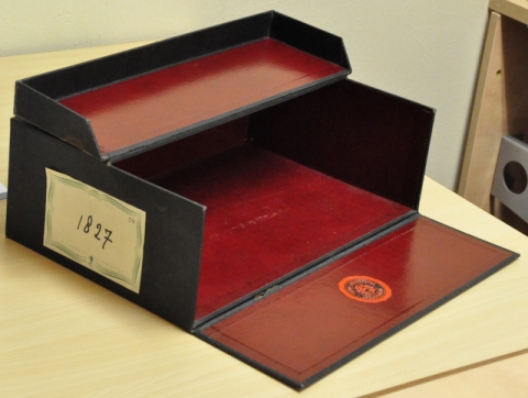 Fraaie archiefdoos afkomstig uit het archief van de voormalige gemeente Utingeradeel uit de periode 1920-1930, gebruikt voor het opbergen van brieven en aktes.