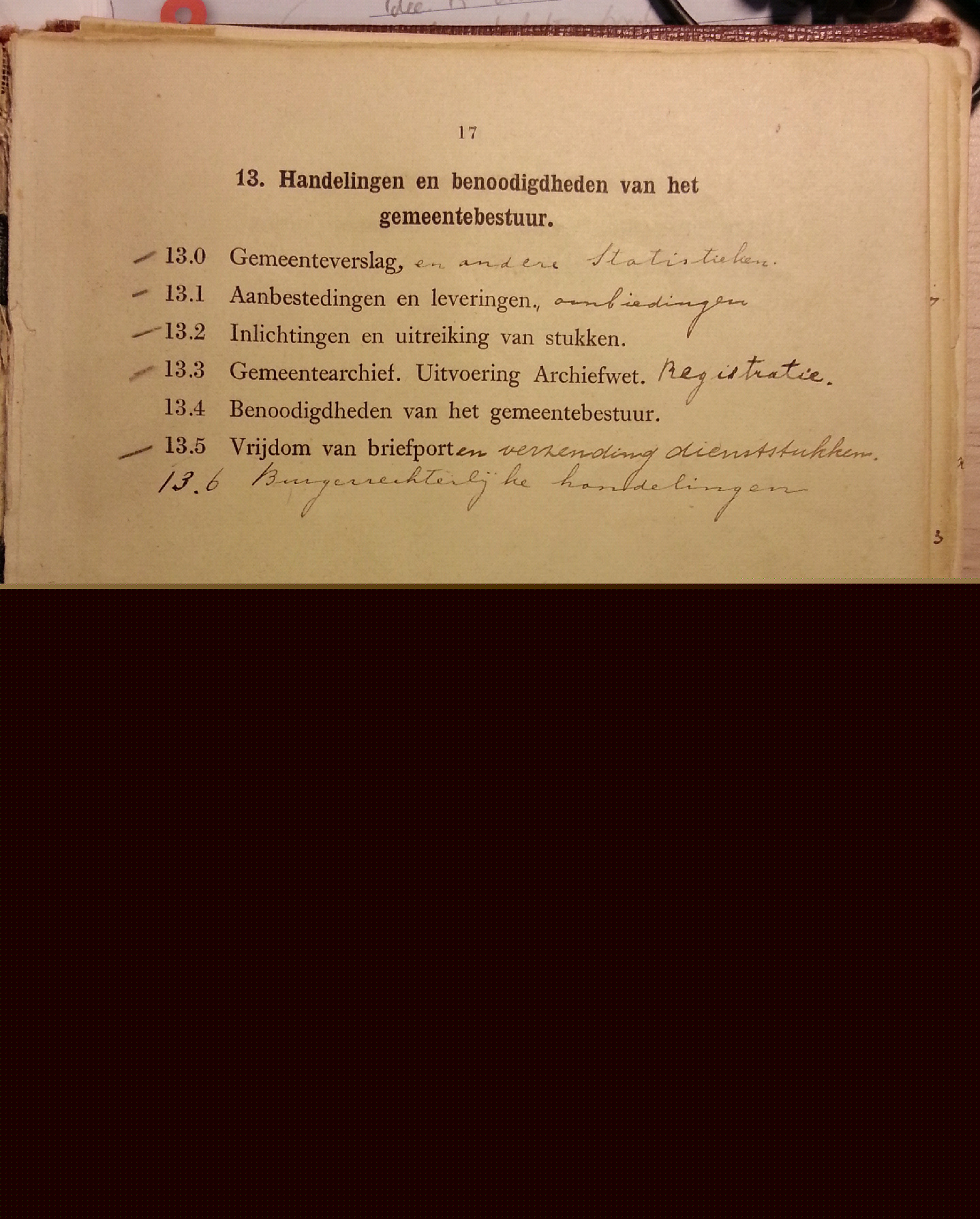 Pagina uit het Bloemendaalsche registratuurstelsel. Volgens rubriek nummer 13 is het archief hier geen onderdeel van de cultuur maar (als administratie?) onderdeel van de bedrijfsvoering.